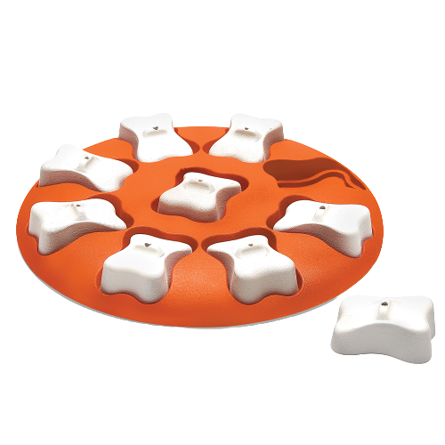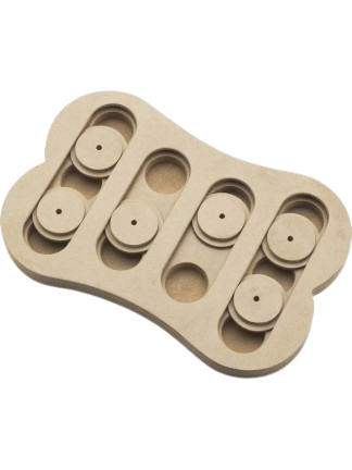 The Seek-A-Treat Shuffle Bone Toy is like a canine version of a puzzle board. This simplified design makes dogs slide the puzzle pieces back and forth to uncover treats hidden underneath. It’s a great way to engage your dog’s problem-solving skills and keep them entertained, especially for a beginner level pet.